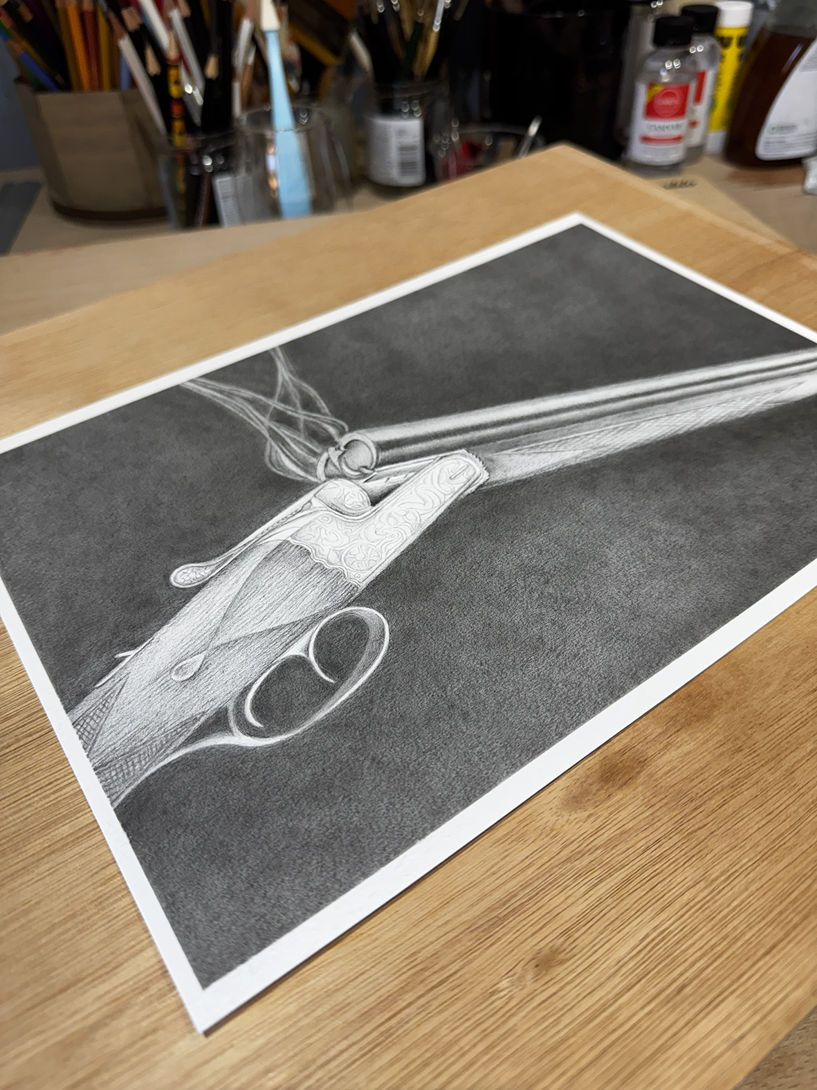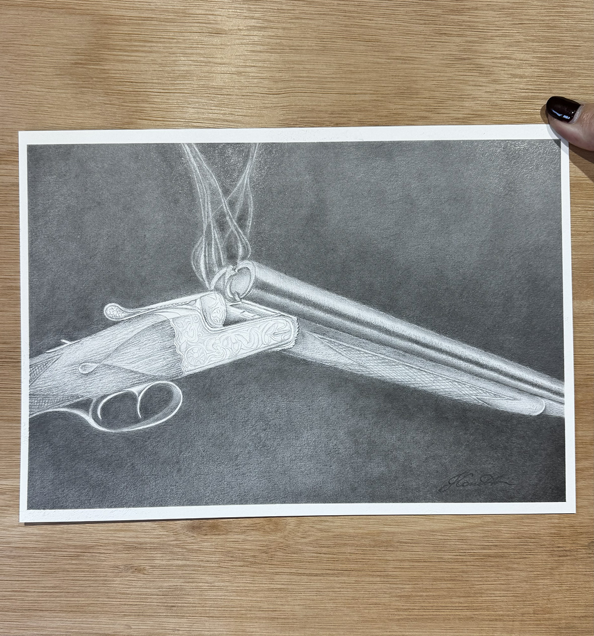 A finely rendered vintage side-by-side shotgun rests open just after firing, delicate ribbons of smoke still drifting from its barrels. This quiet moment — suspended between action and stillness — becomes the focus of the drawing, inviting the viewer to pause in the breath that follows release. Executed in graphite on paper, the work celebrates the mechanical beauty and traditional craftsmanship of classic sporting arms. Intricate hand-engraved detailing on the action is captured with precision, set against soft tonal gradients that describe steel, wood, and drifting smoke. From the subtle texture of the stock to the gleam of engraved metalwork, each element reflects a deep appreciation for heritage, craft, and the expressive potential of graphite itself.